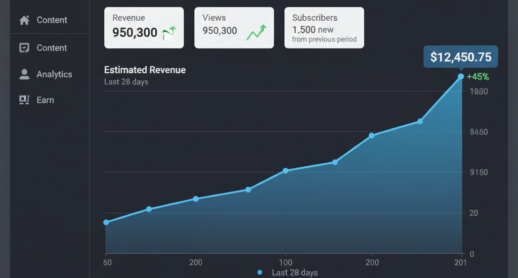 - Subject: YouTube analytics dashboard with rising revenue graph.